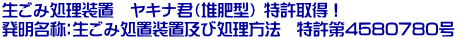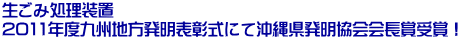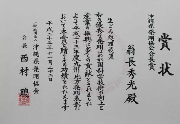 去る平成22年10月24日に開催された第39回平成22年度沖縄県発明くふう展 特許・実用新案の部において、当社光エンジニアの生ごみ処理機及び処理方法(ヤキナ君)が栄えある県知事賞 最優秀賞を受賞いたしました。 これを機会に多くの方々に、生ごみ処理機ヤキナ君を知っていただき、地域や社会におけるごみの問題に対して少しでも目を向けていただき、またヤキナ君をご活用していただくことで、その問題を解決していただけたらと願います。